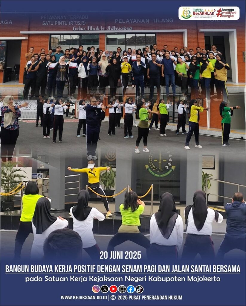 Pada Hari Jumat, 20 Juni 2025 bertempat di halaman kantor Kejaksaan Negeri Mojokerto Jl. RA Basuni No. 360 Sooko telah dilaksanakan Senam Pagi yang diikuti oleh seluruh Pegawai dan PPNPN Kejaksaan Negeri Kabupaten Mojokerto.